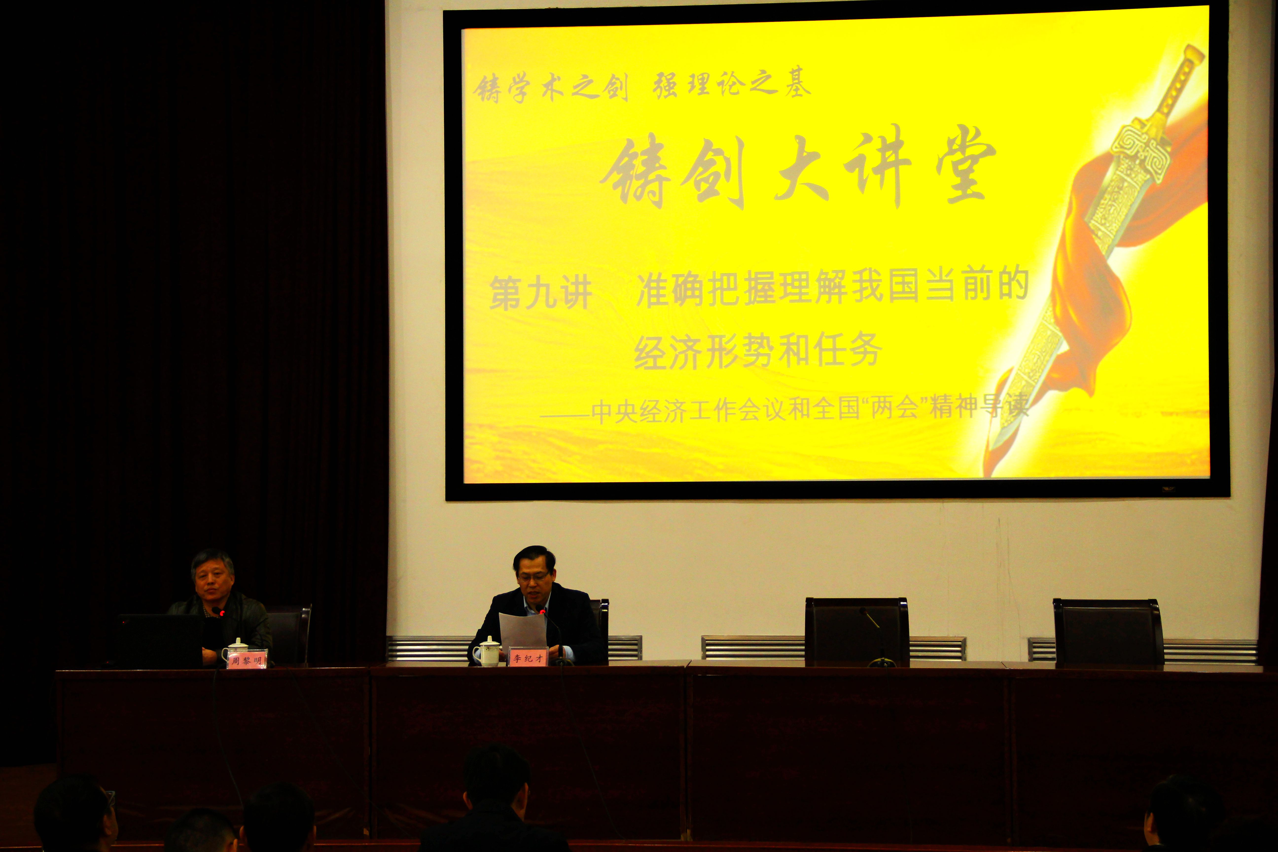 冰雪消融寒冬去,花蕾枝头雨报春。在这样一个充满希望的季节里,365bet足球现金网_必发365手机版下载_mobile 365365051党委党校(365bet足球现金网_必发365手机版下载_mobile 365365051行政学院)第九期铸剑大讲堂活动于3月20日在学术交流中心2号报告厅举行。本期铸剑大讲堂活动由365bet足球现金网_必发365手机版下载_mobile 365365051党委党校(365bet足球现金网_必发365手机版下载_mobile 365365051行政学院)现代科技教研部主任周黎明教授做题为《准确把握理解我国当前的经济形势和任务》的专题报告。常务副校(院)长赵建东同志以及在校的学员、教职工共300余人参加了此次活动。活动由副校(院)长李纪才主持。